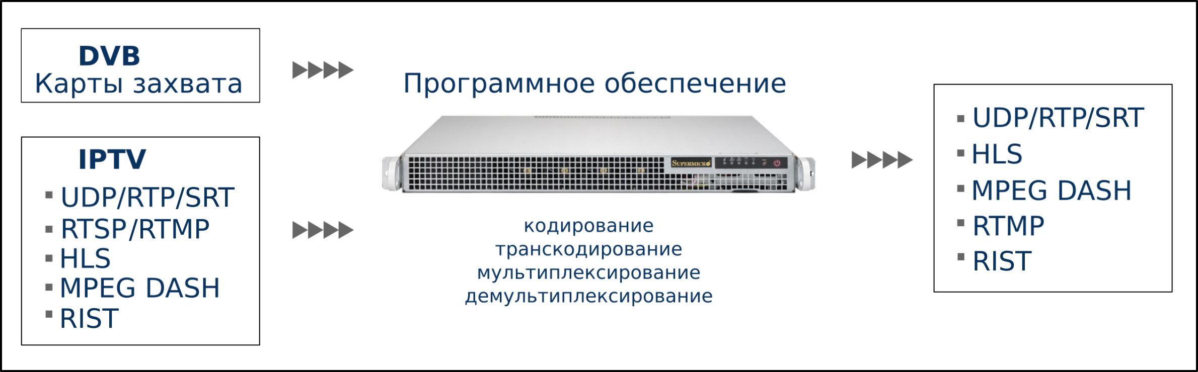 IPTV (UDP/RTP/SRT, HLS/MPEG DASH, RTSP, RTMP, RIST) as well as DVB with DVB signal capture cards are usually utilized as a video source in such projects. The following protocols - UDP/RTP/SRT, HLS/MPEG DASH, RTMP, RIST, NDI, ST 2110 are used for broadcasting.